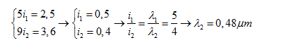 Trong thí nghiệm Y-âng về giao thoa với ánh sáng đơn sắc, khi dùng ánh sáng có bước sóng λ1= 0,60 m thì trên màn quan sát, khoảng cách từ vân sáng trung tâm đến vân sáng bậc 5 là 2,5 mm. Nếu dùng ánh sáng có bước sóng λ2 thì khoảng cách từ vân sáng trung tâm đến vân sáng bậc 9 là 3,6 mm. Bước sóng λ2 là