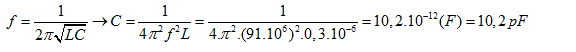 Mạch dao động ở lối vào của một máy thu thanh gồm cuộn cảm có độ tự cảm 0,3 µH và tụ điện có điện dung thay đổi được. Biết rằng, muốn thu được một sóng điện từ thì tần số riêng của mạch dao động phải bằng tần số của sóng điện từ cần thu (để có cộng hưởng). Để thu được sóng của hệ phát thanh VOV giao thông có tần số 91 MHz thì phải điều chỉnh điện dung của tụ điện tới giá trị