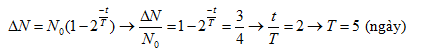 Ban đầu có N0 hạt nhân của một đồng vị phóng xạ. Tính từ lúc ban đầu, trong khoảng thời gian 10 ngày có 3/4 số hạt nhân của đồng vị phóng xạ đó đã bị phân rã. Chu kì bán rã của đồng vị phóng xạ này là