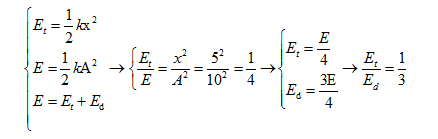 Một vật dao động điều hòa với biên độ 10 cm. Chọn mốc thế năng ở vị trí cân bằng. Tại vị trí vật có li độ 5 cm, tỉ số giữa thế năng và động năng của vật là
