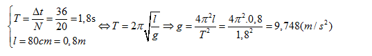 Trong thực hành, để đo gia tốc trọng trường, một học sinh dùng một con lắc đơn có chiều dài dây treo 80 cm. Khi cho con lắc dao động điều hòa, học sinh này thấy con lắc thực hiện được 20 dao động toàn phần trong thời gian 36 s. Theo kết quả thí nghiệm trên, gia tốc trọng trường tại nơi học sinh làm thí nghiệm bằng