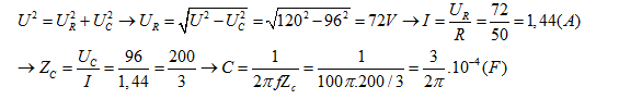 Đặt điện áp xoay chiều 120 V - 50 Hz vào hai đầu đoạn mạch gồm điện trở thuần R = 50 Ω mắc nối tiếp với tụ điện có điện dung C. Điện áp hiệu dụng giữa hai bảng tụ điện là 96 V. Giá trị của C là