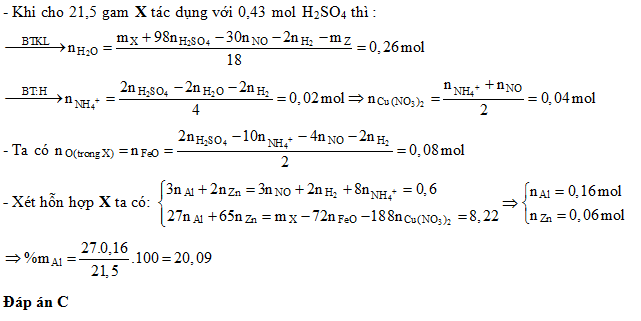 Hòa tan hoàn toàn 21,5 gam hỗn hợp X gồm Al, Zn, FeO, Cu(NO3)2 cần dùng hết 430 ml dung dịch H2SO4 1M thu được hỗn hợp khí Y (đktc) gồm 0,06 mol NO và 0,13 mol H2, đồng thời thu được dung dịch Z chỉ chứa các muối sunfat trung hòa. Cô cạn dung dịch Z thu được 56,9 gam muối khan. Thành phần phần trăm của Al trong hỗn hợp X có giá trị gần nhất là: