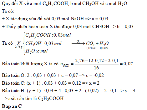 Đốt cháy hoàn toàn 2,76 gam hỗn hợp X gồm CxHyCOOH, CxHyCOOCH3 CH3OH thu được 2,688 lít CO2 (đktc) và 1,8 gam H2O. Mặt khác, cho 2,76 gam X phản ứng vừa đủ với 30 ml dung dịch NaOH 1M, thu được 0,96 gam CH3OH. Công thức của CxHyCOOH là