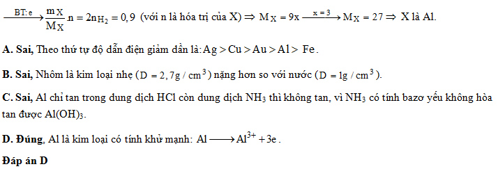 Hòa tan hết 8,1 gam kim loại X vào dung dịch HCl lấy dư thấy thu được 10,08 lít khí H2 (đktc). Nhận xét về kim loại X là đúng