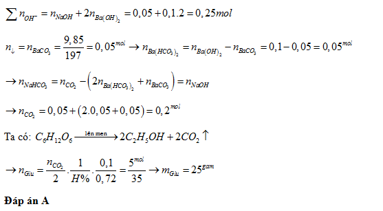 Lên men m gam glucozơ với hiệu suất 72%. Lượng CO2 sinh ra được hấp thụ toàn toàn vào 500 ml dd hỗn hợp gồm NaOH 0,1M và 0,2M sinh ra 9,85 gam kết tủa. Giá trị của m là