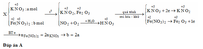 Nhiệt phân hoàn toàn hỗn hợp X gồm a mol KNO3 và b mol Fe(NO3)2 trong bình chân không thu được chất rắn Y và hỗn hợp khí Z. Cho toàn bộ Z vào nước thì thu được dung dịch HNO3 và không có khí thoát ra. Biểu thức liên hệ giữa a và b là: