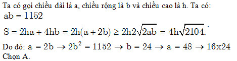 Một người xây nhà xưởng hình hộp chữ nhật có diện tích mặt sàn là 1152 (m2) và chiều cao cố định. Người đó xây các bức tường xung quanh và bên trong để ngăn nhà xưởng thành ba phòng hình chữ nhật có kích thước như nhau (không kể trần).Vậy cần phải xây các phòng theo kích thước nào để tiết kiệm chi phí nhất (bỏ qua độ dầy các bức tường)