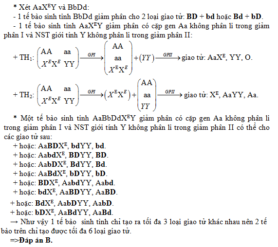 thực hiện quá trình giảm phân, trong đó, ở mỗi tế bào đều xảy ra hiện tượng cặp NST thường chứa cặp gen Aa không phân li ở lần phân bào I, NST giới tính Y không phân li ở lần phân bào II, còn các cặp NST khác đều phân li bình thường. Số loại giao tử tối đa được tạo thành là: