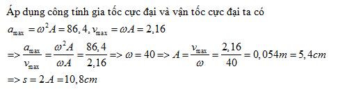 Một vật dao động điều hòa với gia tốc cực đại bằn 86,4 m/s2, vận tốc cực đại bằng 2,16