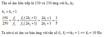 Cho ống sao có một đầu bịt kín và một đầu để hở. Biết rằng ống sáo phát ra âm thanh to nhất ứng với hai tần số của hai họa âm liên tiếp là 150Hz và 250Hz. Tần số âm nhỏ nhất khi ống sao phát ra âm thanh to nhất bằng