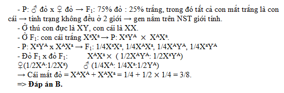 Ở một loài thú, tính trạng màu mắt do một gen quy định. Khi cho con đực mắt đỏ giao phối với con cái mắt đỏ, F1 thu được tỉ lệ 75% mắt đỏ: 25% mắt trắng, trong đó tất cả các cá thể mắt trắng đều là cái. Nếu cho các cá thể mắt đỏ F1 giao phối tự do với nhau thì tỉ lệ con cái mắt đỏ thu được ở đời lai là bao nhiêu?