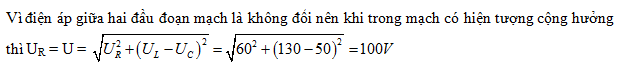 Đặt vào hai đầu đoạn mạch RLC nối tiếp một điện áp xoay chiều có giá trị hiệu dụng không đổi thì điện áp hiệu dụng trên các phần tử R,L,C lần lượt là 60V, 130V, 50V. Nếu thay tụ C bằng C’ để mạch có cộng hưởng điện thì điện áp hiệu dụng giữa hai đầu điện trở R là