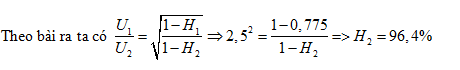 Điện năng ở một trạm phát điện được truyền đi dưới điện áp (ở đầu đường dây tải) là 20kV, hiệu suất của quá trình truyền tải điện là H=77,5%. Công suất điện truyền không đổi. Khi tăng điện áp ở đầu đường dây tải điện lên 50kV thì hiệu suất của quá trình truyền tải đạt giá trị