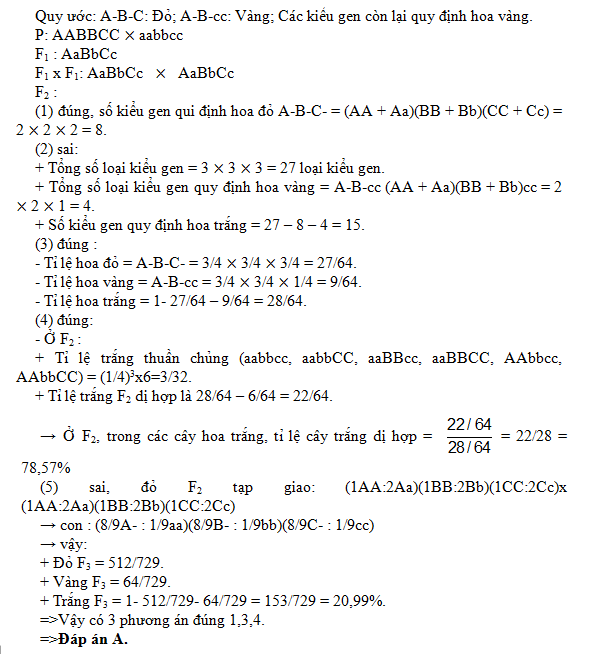 (5) Nếu cho tất cả các cây hoa đỏ ở F2 tạp giao, tỉ lệ hoa trắng thu được ở đời lai là 29,77%.