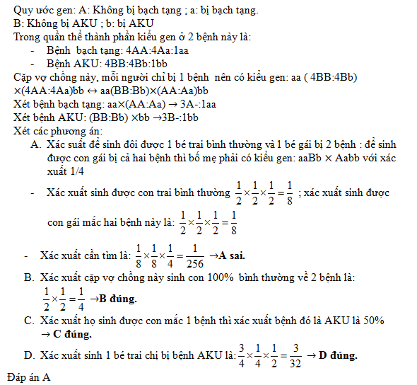 Biết rằng các gen A, B nằm trên các cặp nhiễm sắc thể thường khác nhau, không phát sinh đột biến. Tần số mỗi alen trội trong quần thể là 2/3. Một người chỉ mắc bệnh bạch tạng lấy một người chỉ mắc bệnh AKU thì kết luận nào sau đây là sai?