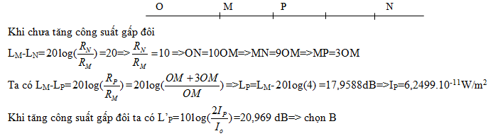 Bốn điểm O, M,P, N theo thứ tự là các điểm thẳng hàng trong không khí và NP = 2MP. Khi đặt một nguồn âm (là nguồn điểm) tại O thì mức cường độ âm tại M và N lần lượt là LM = 30 dB và LN = 10 dB. Cho rằng môi trường truyền âm đẳng hướng và không hấp thụ âm. Nếu tăng công suất nguồn âm lên gấp đôi thì mức cường độ âm tại P xấp xỉ bằng