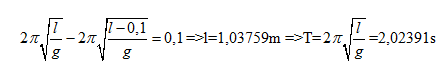 Một con lắc đơn có chu kỳ dao động điều hòa là T. Khi giảm chiều dài con lắc 10 cm thì chu kỳ dao động của con lắc biến thiên 0,1 s. Chu kỳ dao động T ban đầu của con lắc là