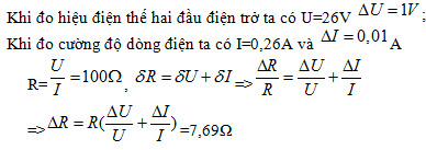 Đặt một điện áp xoay chiều ổn định vào hai đầu mạch RLC mắc nối tiếp. Dùng một đồng hồ đo điện đa năng lí tưởng để đo điện trở thuần R trong mạch. Khi đo điện áp giữa hai đầu điện trở với thang đo 100 V, thì kim chỉ thị của đồng hồ ở vị trí như hình vẽ. Khi đo cường độ dòng điện qua mạch với thang đo 1A, thì kim chỉ thị của đồng hồ vẫn ở vị trí như cũ. Lấy sai số dụng cụ đo là nửa độ chia nhỏ nhất. Kết quả đo điện trở được viết là