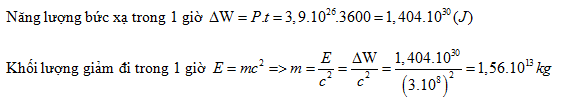Công suất phát xạ của Mặt Trời là 3,9.1026 W. Cho c = 3.108 m/s. Trong một giờ khối lượng Mặt