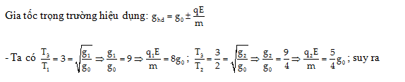 Có ba con lắc cùng chiều dài dây treo, cùng khối lượng. Con lắc thứ nhất và thứ hai mang điện tích q1 và q2, con lắc thứ ba không mang điện tích. Chu kì dao động điều hoà của chúng trong điện trường có phương thẳng đứng lần lượt là T1, T2 và T3 với T3 = 3T1; 3T2 = 2T3. Tính q1 và q2. Biết q1 + q2 = 7,4.10-8 C.