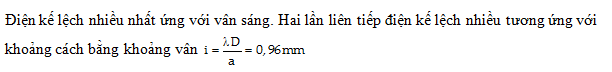 Trong thí nghiệm giao thoa Y-âng, nguồn S phát bức xạ có bước sóng 600 nm, khoảng cách giữa hai khe 1,5 mm, màn quan sát E cách mặt phẳng hai khe 2,4 m. Dịch chuyển một mối hàn của cặp nhiệt điện trên màn E theo đường song song với mặt phẳng chứa hai khe, thì cứ sau một khoảng bằng bao nhiêu kim điện kế lại lệch nhiều nhất?