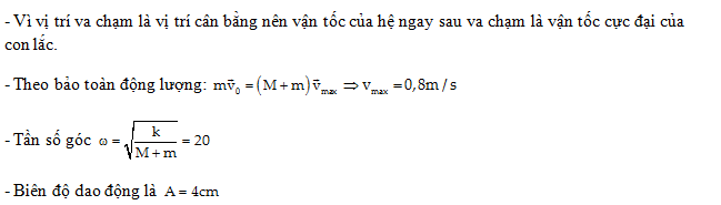 Một con lắc lò xo có độ cứng 40 N/m và khối lượng vật M là 75 g đang nằm yên trên mặt phẳng ngang, nhắn. Một vật nhỏ m có khối lượng 25 g chuyển động theo phương trùng với trục lò xo với tốc độ 3,2 m/s đến va chạm và dính chặt vào M. Sau va chạm, hai vật dao động điều hòa với biên độ bằng