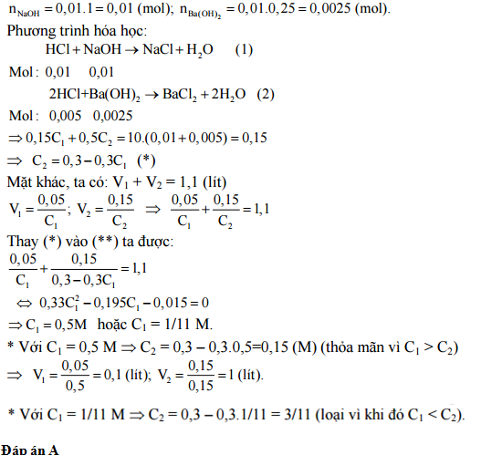 Dung dịch X và dung dịchY là các dung dịch HCl với nồng độ mol tương ứng là C1 và C2 (Mol/lít), trong đó C1 > C2. Trộn 150 ml dung dịch X với 500 ml dung dịch Y, thu được dung dịch Z. Để trung hòa 1/10 dung dịch Z cần 10 ml dung dịch hỗn hợp NaOH 1 M và Ba(OH)2 0,25 M. Mặt khác lấy V1 lít dung dịch X chứa 0,05 mol HCl trộn với V2 lít dung dịch Y chứa 0,15 mol HCl thu được 1,1 lít dung dịch.