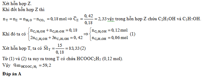 Hỗn hợp T gồm 2 este đơn chức X, Y (MX< MY). Đun nóng 15 gam T với một lượng dung dịch NaOH vừa đủ, thu được m gam hỗn hợp Z gồm 2 ancol (có phân tử khối hơn kém nhau 14u) và hỗn hợp hai muối. Đốt cháy m gam Z, thu được 9,408 lít CO2 (đktc) và 10,8 gam H2O. Phần trăm khối lượng của X trong T là