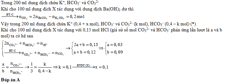 Hấp thụ hết 4,48 lít khí CO2 (đktc) vào dung dịch chứa x mol KOH và y mol K2CO3, thu được 200 ml dung dịch X. Cho từ từ đến hết 100 ml dung dịch X vào 300 ml dung dịch HCl 0,5M, thu được 2,688 lít khí (đktc). Mặt khác, cho 100 ml dung dịch X tác dụng với dung dịch Ba(OH)2 dư, thu được 39,4 gam kết tủa. Giá trị của x là