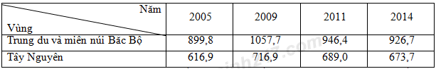 Cho bảng số liệu: SỐ LƯỢNG BÒ CỦA TRUNG DU VÀ MIỀN NÚI BẮC BỘ, TÂY NGUYÊN GIAI ĐOẠN 2005 -