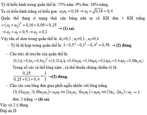 (3) Trong số cá thể mang kiểu hình lông xám của quần thể số cá thể thuần chủng chiếm tỉ lệ: 1/3.