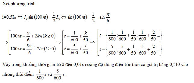 Dòng điện chạy qua một đoạn mạch có biểu thức i = I0sin100πt. Trong khoảng thời gian từ 0 đến 0,01s cường độ dòng điện tức thời có giá trị bằng 0,5I0 vào những thời điểmA.