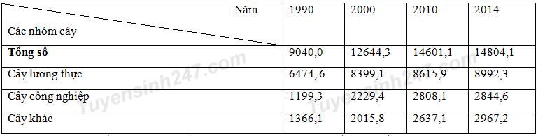 Cho bảng số liệu sau DIỆN TÍCH GIEO TRỒNG PHÂN THEO NHÓM CÂY CỦA NƯỚC TA QUA CÁC NĂM (Đơn vị: