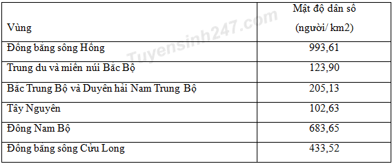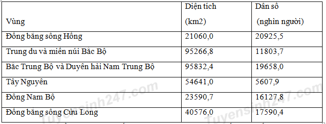Cho bảng số liệu sau DIỆN TÍCH VÀ DÂN SỐ CÁC VÙNG TRÊN CẢ NƯỚC NĂM 2015 Nguồn: Niên giám