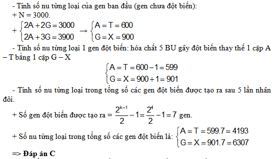Một gen có chiều dài 0,51µm và có 3900 liên kết hiđrô tiến hành nhân đôi 5 đợt. Nếu trong lần nhân đôi đầu tiên của gen đã có 1 phân tử 5-Brôm Uraxin liên kết với một nuclêôtit trên một mạch khuôn của gen thì tổng số nucleotit mỗi loại có trong các gen đột biến là bao nhiêu? Biết rằng 5-Brôm Uraxin chỉ có một lần thay đổi cấu trúc trong suốt quá trình nhân đôi của gen trên.