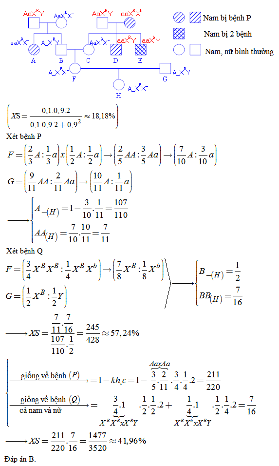 (4) Xác suất để cặp vợ chồng (F) và (G) sinh thêm 2 đứa con có cả trai lẫn gái và đều có kiểu hình giống nhau về cả 2 bệnh trên là 41,96%.