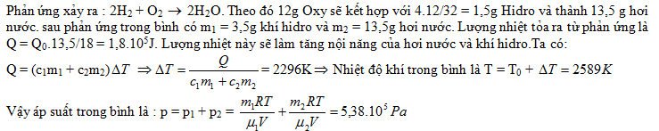Trong một bình cách nhiệt dung tích 100l có chứa 5g khí hidro và 12g khí oxy ở nhiệt độ t0 = 200C. Xác định nhiệt độ và áp suất trong bình sau khi đốt cháy hỗn hợp trên, biết rằng khi tạo thành một mol nước thì tỏa ra một nhiệt lượng Q0 = 2,4.105J. Cho nhiệt dung riêng đẳng tích của khí hidro và nước lần lượt là C1 = 14,3kJ/kg.K và C2 = 2,1kJ/kg.K