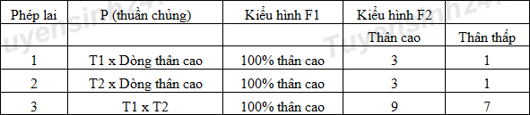 Ở một loài TV, tính trạng chiều cao cây do gen nằm trên NST thường quy định. Thực hiện 3 phép lai với 2 dòng thân thấp thuần chủng (T1, T2) có nguồn gốc khác nhau thu được kết quả sau :