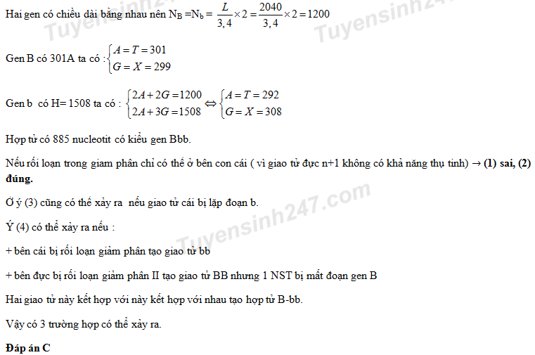 Ở một loài TV, xét 1 gen có 2 alen B và b có chiều dài bằng nhau và bằng 2040Ao. Alen B có 301 nucleotit loại adenin, alen b có 1508 liên kết hidro. Lấy hạt phấn của cây có KG Bb thụ phấn với cây có KG bb thu được hợp tử có tổng số 885 nucleotit lại adenin. Hợp tử trên có thể được hình thành do :