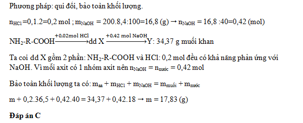 Cho m gam hỗn hợp 2 aminoaxit (phân tử chỉ chứa 1 nhóm –NH2 và 1 nhóm –COOH) tác dụng với 100ml dung dịch HCl 2M được dung dịch X. Để phản ứng vừa hết với các chất trong dung dịch X cần vừa đủ 200 gam dung dịch NaOH 8,4% được dung dịch Y. Cô cạn dung dịch Y được 34,37 gam chất rắn khan. Giá trị của m là: