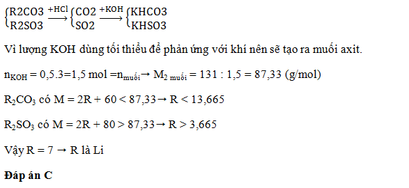 Hòa tan hoàn toàn 131 gam hỗn hợp 2 muối cacbonat và sunfit của kim loại kiềm vào dung dịch HCl dư đến phản ứng hoàn toàn thu được hỗn hợp khí X. Để hấp thụ khí X sinh ra cần tối thiểu 500ml dung dịch KOH 3M. Kim loại kiềm là: