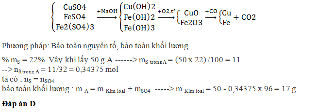 Cho hỗn hợp A gồm CuSO4, FeSO4, Fe2(SO4)3 có phần trăm khối lượng của S là 22%. Lấy 50 gam hỗn