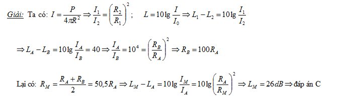 Ba điểm O, A, B cùng nằm trên một nửa đường thẳng xuất phát từ O. Tại O đặt một nguồn điểm phát sóng âm đẳng hướng trong không gian, môi trường không hấp thụ âm. Mức cường độ âm tại A là 60dB, tại B là 20dB. Mức cường độ âm tại trung điểm M của đoạn AB là