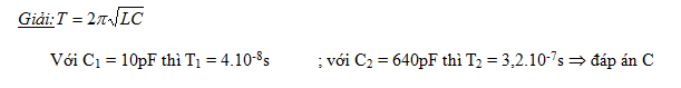 Một mạch dao động lí tưởng gồm cuộn cảm có độ tự cảm 4mH và một tụ điện có điện dung biến đổi từ 10pF đến 640 fF. Lấy pi2 = 10. Chu kỳ dao động riêng của mạch này có giá trị