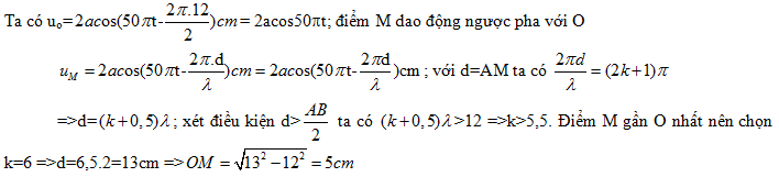 t (với t tính bằng s). Tốc độ truyền sóng của mặt chất lỏng là 50cm/s. Gọi O là trung điểm của AB, điểm M ở mặt chất lỏng nằm trên đường trung trực của AB và gần O nhất sao cho phần tử chất lỏng tại M dao động ngược pha với phần tử chất lỏng tại O. Khoảng cách MO là