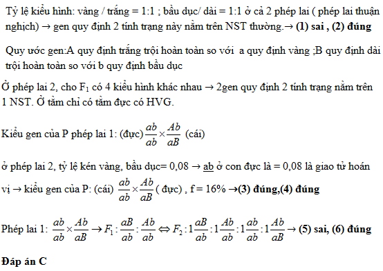Phép lai 2: Cho bướm tằm cái sinh ra từ kén màu vàng, hình bầu dục giao phối với một bướm tằm đực sinh ra từ kén màu trắng, hình dài thu được F1 672 kén màu vàng, hình dài; 672 kén màu trắng, bầu dục; 128 kén màu vàng, hình bầu dục; 128 kén màu trắng, hình dài. Biết rằng các tính trạng trội là trội hoàn toàn.