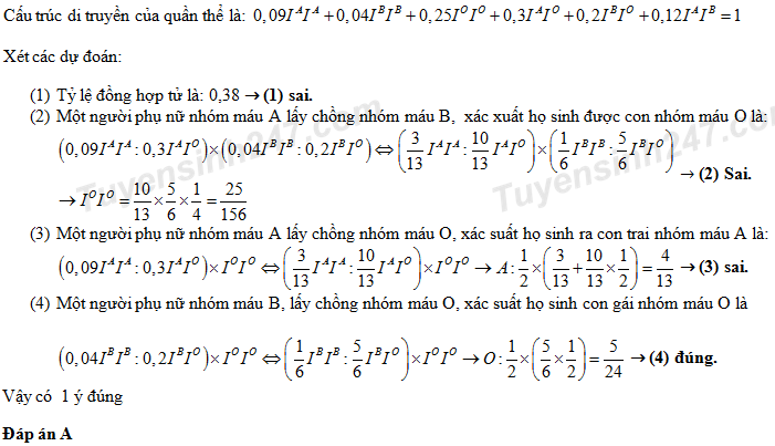 (3). Một người phụ nữ nhóm máu A lấy chồng nhóm máu O, xác suất họ sinh ra con trai nhóm máu A là 6/13.