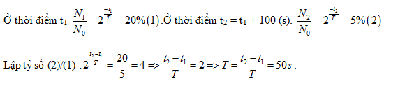 Ban đầu (t=0) có một mẫu chất phóng xạ X nguyên chất. Ở thời điểm t1 mẫu chất phóng xạ X còn lại 20% hạt nhân chưa bị phân rã. Đến thời điểm t2 = t1 + 100 (s) số hạt nhân X chưa bị phân rã chỉ còn 5% so với số hạt nhân ban đầu. Chu kì bán rã của chất phóng xạ đó là