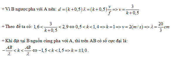 Hai điểm A và B trên mặt nước cách nhau 10 cm. Nếu đặt tại A có một nguồn sóng cơ dao động có tần số f = 30Hz, tốc độ truyền sóng là một giá trị nào đó trong khoảng1,6 (m /s) < v < 2,9 (m/s) thì tại B luôn dao động ngược pha với dao động tại A. Bây giờ, nếu tại B đặt thêm một nguồn giống như tại A thì trên AB số điểm dao động với biên độ cực đại là